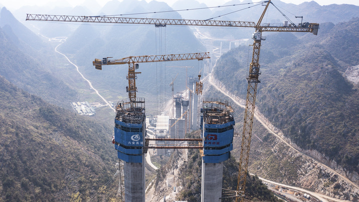 1月31日拍攝的六安高速花江峽谷大橋施工現(xiàn)場(無人機照片)。新華社記者 陶亮 攝