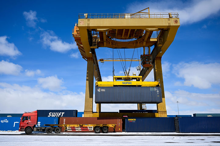 一輛貨車在滿洲里站貨運車間集裝箱場裝卸集裝箱(3月15日攝)。新華社記者 貝赫 攝