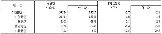 1—4月份,全國房地產(chǎn)開發(fā)投資39154億元,同比下降2.7%;其中,住宅投資29527億元,下降2.1%。