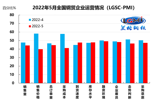蘭格鋼鐵云商平臺統(tǒng)計發(fā)布的2022年5月份鋼鐵流通業(yè)PMI總指數(shù)為47.2%,比上月下降3.4個百分點,再次進(jìn)入收縮區(qū)間。從分類指數(shù)看,構(gòu)成鋼鐵流通業(yè)