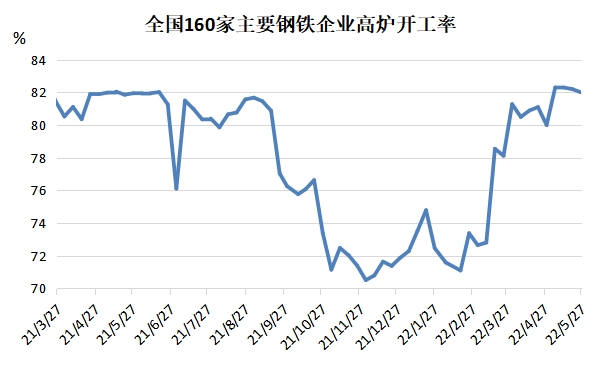 據(jù)蘭格鋼鐵網(wǎng)統(tǒng)計(jì)數(shù)據(jù)顯示,截止到5月27日全國(guó)160家主要鋼鐵企業(yè)高爐開(kāi)工率為82.00%,較4月底上漲2個(gè)百分點(diǎn)。目前以唐山為代表的的北方鋼廠減產(chǎn)意愿不強(qiáng),以華東為代表的的南方鋼廠梅雨季節(jié)將至,更傾向暫時(shí)減產(chǎn)以緩解庫(kù)存壓力。另外,根據(jù)中鋼協(xié)統(tǒng)計(jì)重點(diǎn)企業(yè)生產(chǎn)情況來(lái)看,截止到5月中旬,累計(jì)日產(chǎn)粗鋼230.12萬(wàn)噸,環(huán)比增長(zhǎng)1.26%。