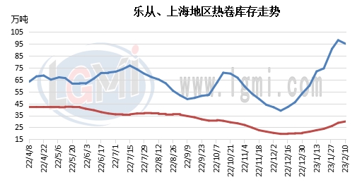 但細(xì)分區(qū)域來看,熱卷市場(chǎng)社會(huì)庫存總量分布較為集中,主要增量來源來自河北唐山、黃驊等部分區(qū)域以及樂從區(qū)域,相對(duì)而言,作為熱卷主要消耗地區(qū)的華東市場(chǎng)社會(huì)庫存依然處于正常范圍。而后期隨著需求端緩慢恢復(fù),熱卷市場(chǎng)資源消化情況加快,社會(huì)庫存累庫不平衡的局面也將得到有效改善。特別是本周以來,樂從高位庫存已經(jīng)開始松動(dòng),截止到2月10日,樂從區(qū)域社會(huì)庫存量為95.04萬噸,較上周小幅下降2.94萬噸。