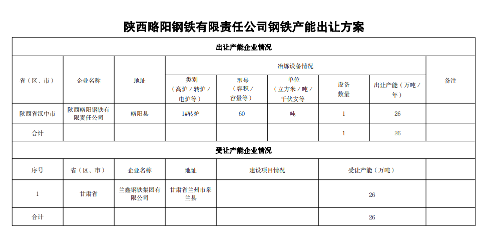 陜西略陽鋼鐵產(chǎn)能置換方案和產(chǎn)能出讓方案公告