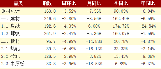 2. 盤線庫(kù)存由升轉(zhuǎn)降,螺紋鋼庫(kù)存下降速度略有加快;熱軋卷板庫(kù)存下降速度略有加快,冷軋庫(kù)存下降速度略有加快,中厚板庫(kù)存下降速度有所放緩