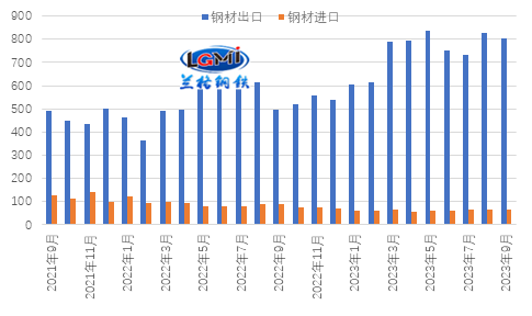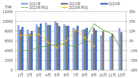 在價(jià)格優(yōu)勢(shì)及前期訂單回升影響下,9月份我國(guó)鋼材出口雖環(huán)比小幅回落、但同比大幅增長(zhǎng)。海關(guān)總署統(tǒng)計(jì)數(shù)據(jù)顯示,2023年9月份,我國(guó)出口鋼材806.3萬(wàn)噸,同比增長(zhǎng)61.9%(詳見圖4);1-9月,我國(guó)出口鋼材6681.8萬(wàn)噸,同比增長(zhǎng)31.8%。進(jìn)口方面,9月份,我國(guó)進(jìn)口鋼材64.0萬(wàn)噸,同比下降28.2%;1-9月,我國(guó)進(jìn)口鋼材569.8萬(wàn)噸,同比下降31.7%。
