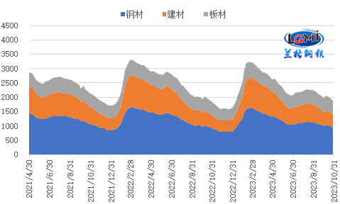 2023年10月份,鋼材社會(huì)庫(kù)存在國(guó)慶節(jié)后短暫回升后,呈現(xiàn)持續(xù)下降態(tài)勢(shì)。據(jù)蘭格鋼鐵網(wǎng)監(jiān)測(cè)數(shù)據(jù)顯示,截至10月底,蘭格鋼鐵網(wǎng)統(tǒng)計(jì)的29個(gè)城市鋼材社會(huì)庫(kù)存為938.9噸,月環(huán)比下降4.8%,年同比上升1.3%。其中,建材社會(huì)庫(kù)存為440.8萬(wàn)噸,月環(huán)比下降10.7%,年同比下降2.7%;板材社會(huì)庫(kù)存為498.0萬(wàn)噸,月環(huán)比上升1.2%,年同比上升5.0%(詳見圖3)。