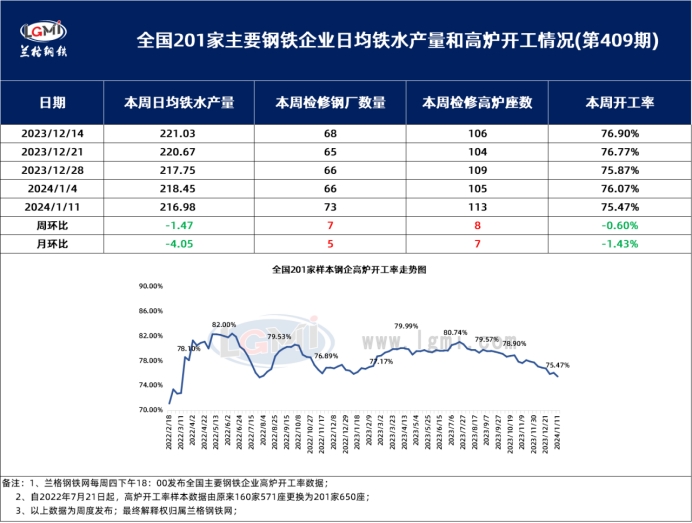 蘭格調研:全國201家生產企業(yè)高爐開工數(shù)據(jù)周報(1月11日) | |