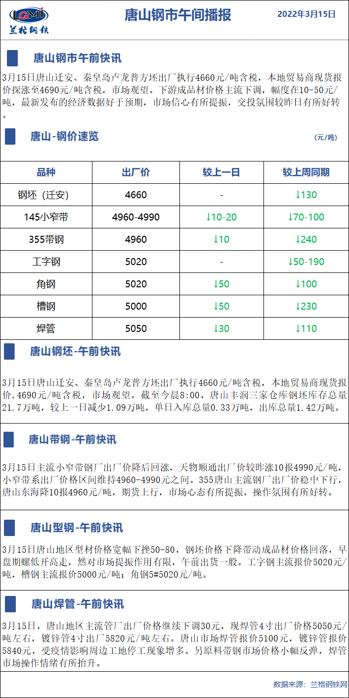 3月15日蘭格唐山鋼市午間播報